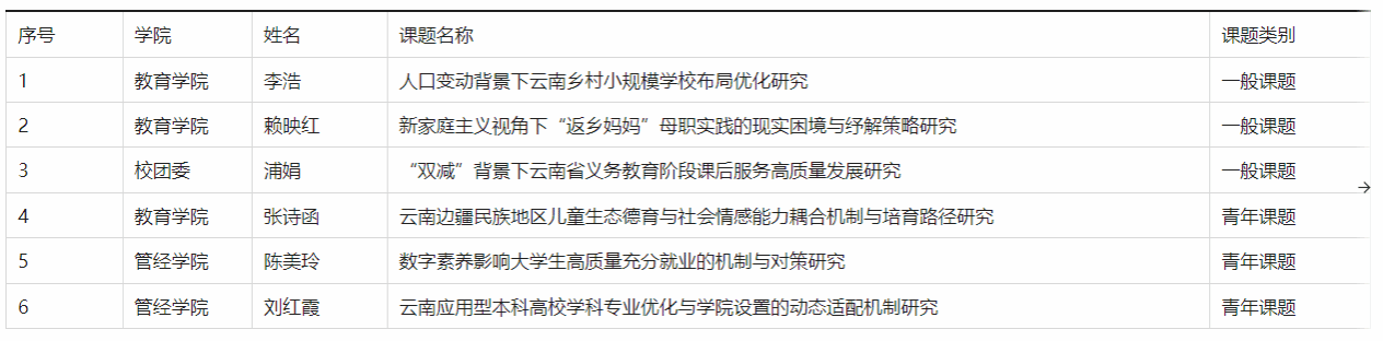 近日,2025年度云南省教育科学规划课题立项名单正式公布。我校获批6项课题,立项数创历史新高,远超往年平均立项水平。在全省高校中,我校立项总数位列第六名。