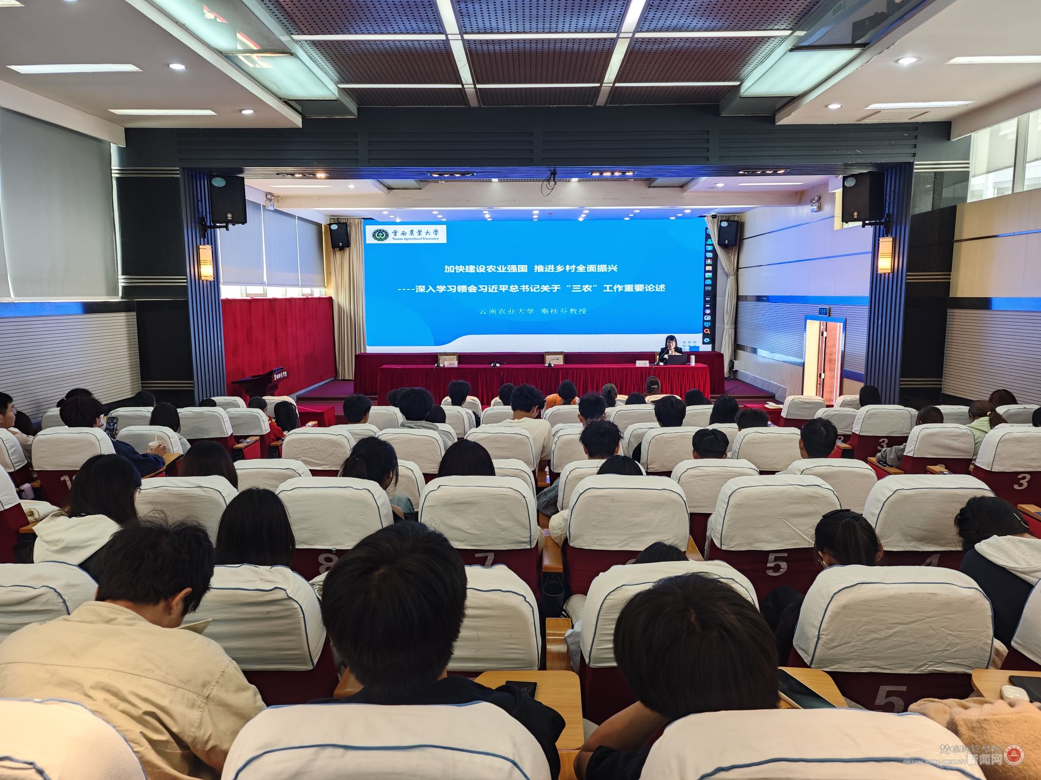 秦教授的讲座主要围绕三部分内容展开。一是系统阐释了习近平总书记关于“三农”工作的重要论述精神,强调了“三农”工作在全党工作中重中之重的地位;二是深入剖析了新时代云南推进乡村全面振兴的形势与任务,详细解读了云南在保障粮食安全和重要农产品供给、巩固拓展脱贫攻坚成果、发展乡村产业、加强乡村建设、提升乡村治理水平等方面的具体任务与目标要求;三是明确提出了务实高效推进云南乡村振兴的各项措施,从政策落实、科技创新、人才培养、产业融合、基层治理等多个维度,阐述如何将宏伟蓝图转化为具体行动,鼓励同学们扎根田野,将论文写在云岭大地上。